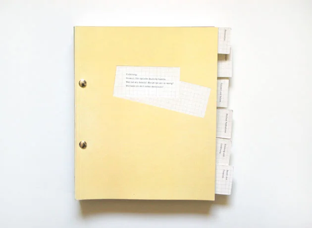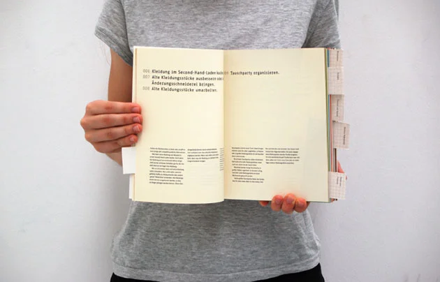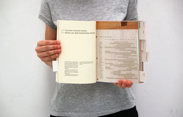 Das Buch besteht aus neun einzelnen Heften. Der Leser kann die einzelnen Kapitel nach seinen Wünschen umsortieren. So beginnt die junge Mutter mit dem Kapitel „Kleidung und Ernährung“, während der Häuslebauer beim Kapitel „Bauen und Finanzen“ anfängt und der arme Student im Kapitel „Energie“ Sparmöglichkeiten findet, die auch der Haushaltskasse zu Gute kommen. Auf diese Weise entsteht ein individueller Farbcode auf dem Buchrücken. Bei allen sechs Hauptkapiteln ragt ein Stück des Umschlags wie ein Post-it nach rechts aus dem Buch heraus. Auf diese Weise kann jedes Kapitel schnell wiedergefunden werden.