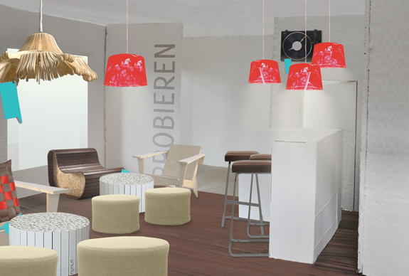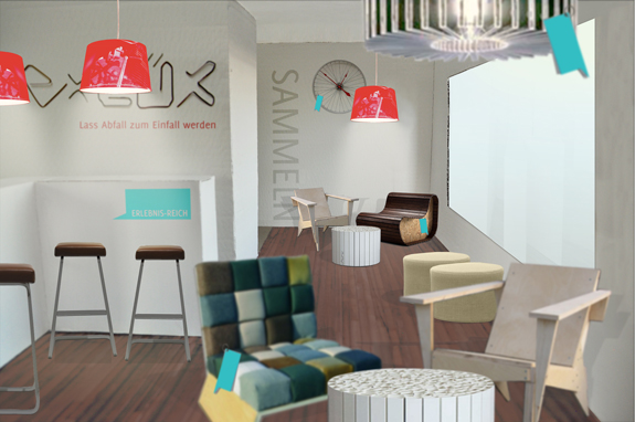 In einer Online-Community entstehen Ideen für Wohnaccessoires aus wiederverwerteten Materialien. (Bild 3) Per User-Voting wird entschieden, welche das meiste Potential haben. Diese werden dann mit dem re:lüx’schen Label versehen (Bild 4) und finden ihren Platz in einem reellen Showroom-Café, dem Erlebnis-Reich, können probegewohnt und ersteigert werden. (Bild 5-7) Der Transfer von der Virtualität in die Realität schafft Authentizität und Lebendigkeit und bietet überraschende Berührungspunkte. Neben den Herzstücken ‘Online Community’ und ‘Erlebnis-Reich’ wurden verschiedene Maßnahmen, wie Kooperationen, Guerilla-Aktionen und Ambient Media-Maßnahmen, konzipiert. (Bild 8-10)