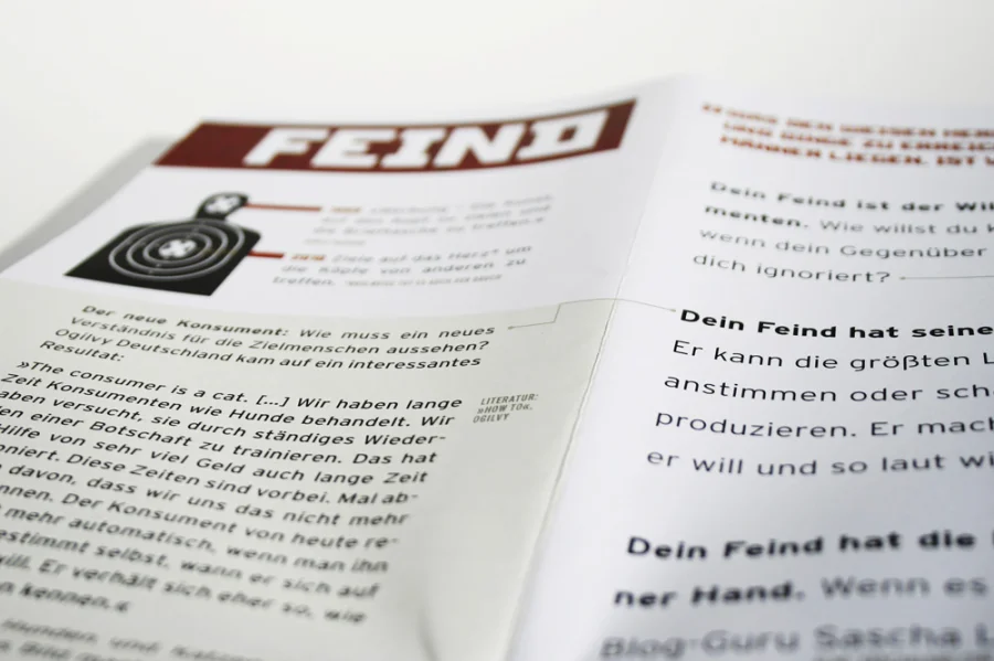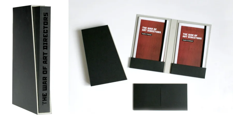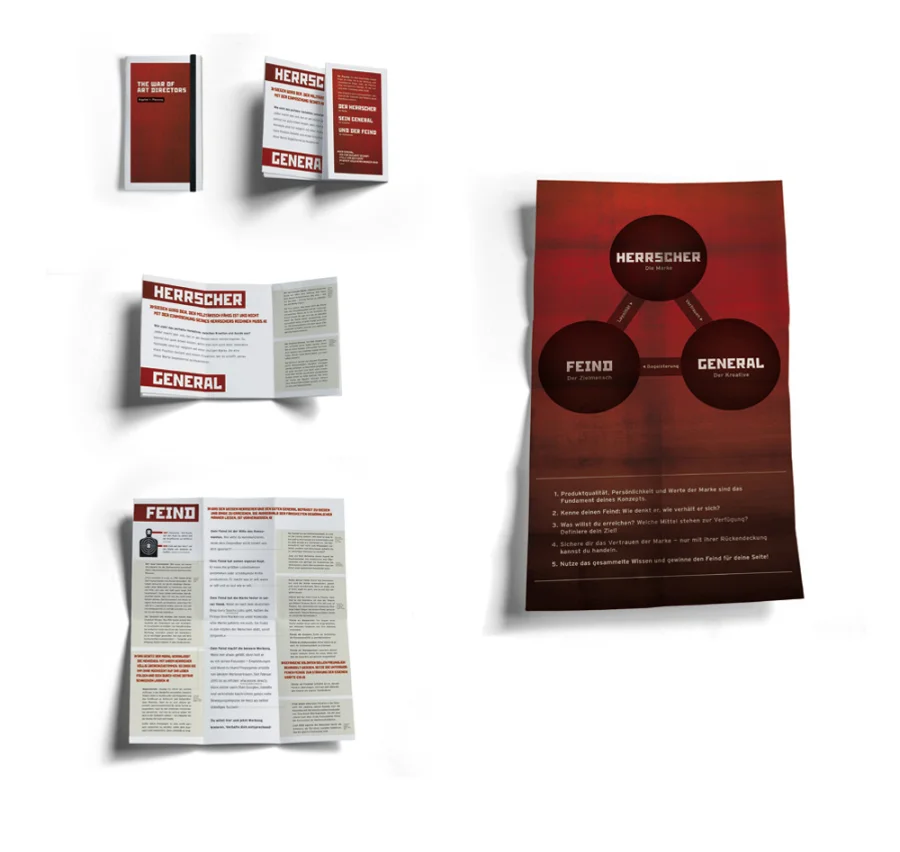 Anstelle einer aufwändigen und wertigen Buchgestaltung, liegt der Augenmerk bei meiner Abschlussarbeit »The War of Art Directors« ganz klar auf Komprimierung und Zweckmäßigkeit. Durch das handliche Format ist dieser Leitfaden das erste Schriftstück, das der Kreative jederzeit mitnehmen kann. Zusätzlich werden digitale Kanäle (Apps, Blog und Twitter) als stets aktuelle Inspirationsquellen genutzt.