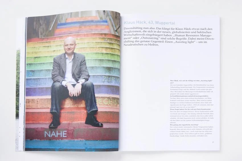 Dieses Magazin widmet sich in Bild und Text den Menschen, die von den Medien gerne als “Downshifter” bezeichnet werden. „Tausch einer finanziell attraktiven, aber stresserfüllten Karriere gegen eine weniger anstrengende, aber mehr erfüllende Lebensweise mit geringerem Einkommen“, so lautet die Definition. Doch welche Gesichter, Geschichten und Gefühle stecken dahinter? Und welchen persönlichen Mehrwert ziehen diese Menschen aus etwas, was von der Gesellschaft als Verlust bezeichnet wird? Im Zusammenspiel der fotografischen Arbeit mit Texten junger Journalisten werden auf sensible Art die Individuen und Zustände sichtbar gemacht, die hinter dem Phänomen des “Downshifting” stehen.