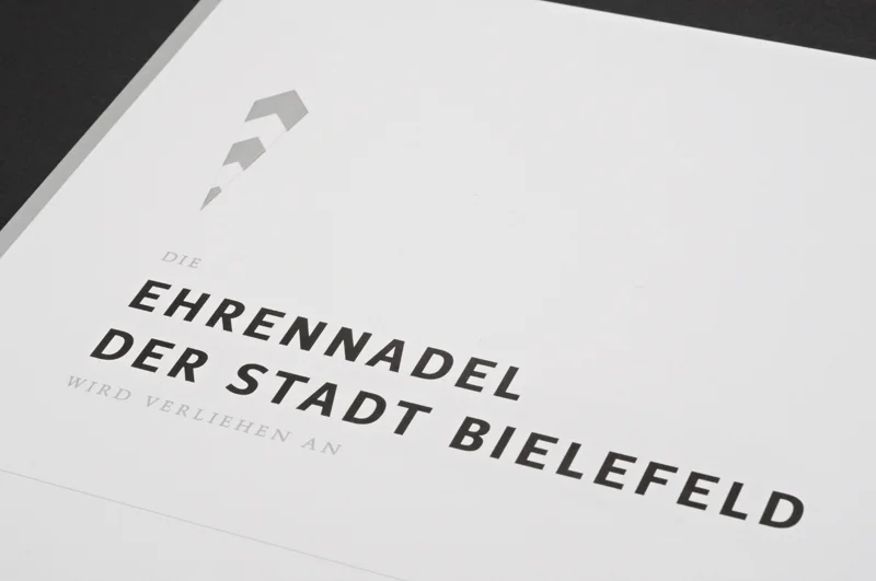 Für die neu konzipierte Auszeichnung der Stadt Bielefeld — für Bürger, die ehrenamtlich besonderes Engagement gezeigt haben — wurde die ›Ehrennadel‹ und die Urkunde samt Schutzmappe gestaltet.