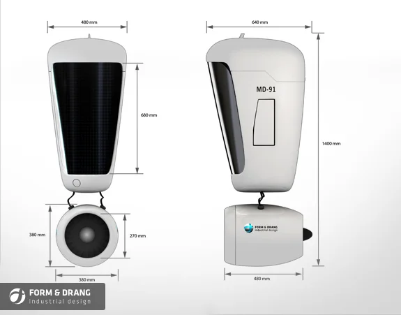 Das Design-Konzept “Flying Robot” hat die Aufgabe Messebesucher oder Touristen zu informieren. Natürlich besitzt es auch die Funktion Neugierde zu wecken und Menschen anzulocken.