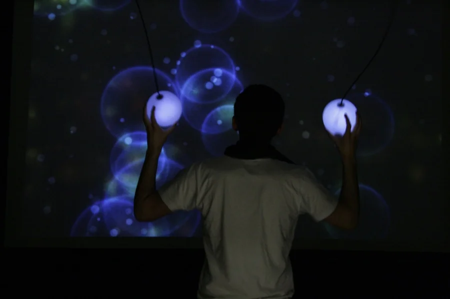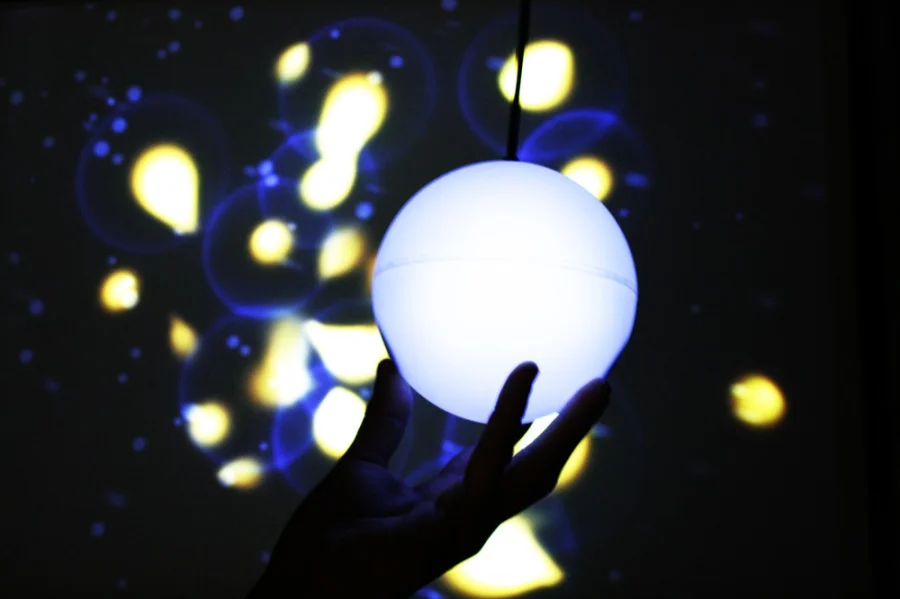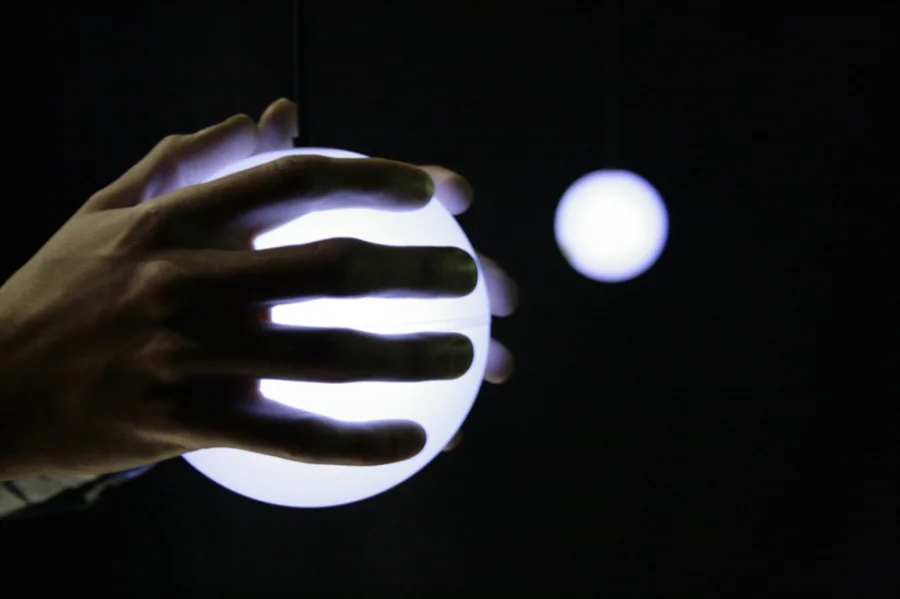 Das Herz des Konzeptes bilden zwei glühende, interaktive Kugeln, die von der Decke hängen. Jede Kugel ist mit Sensoren ausgerüstet, die Bewegung und Drehung wahrnehmen. Diese Daten werden dann in visuelle und akustische Signale übersetzt.