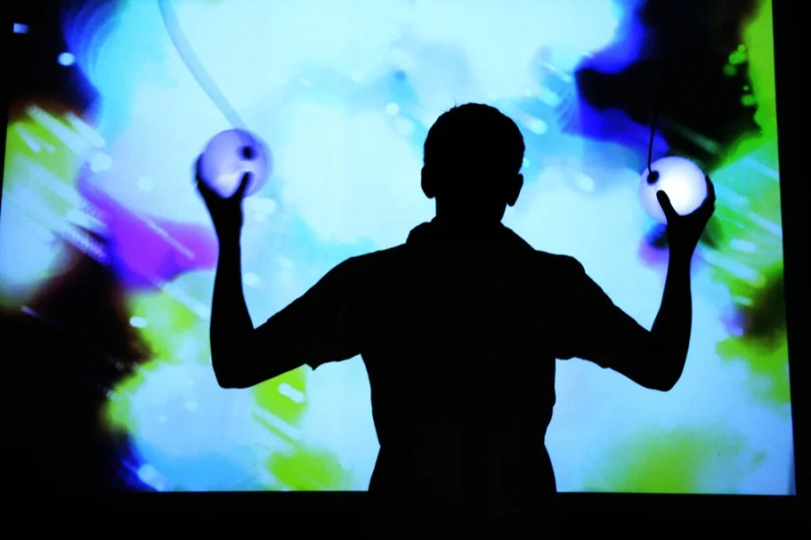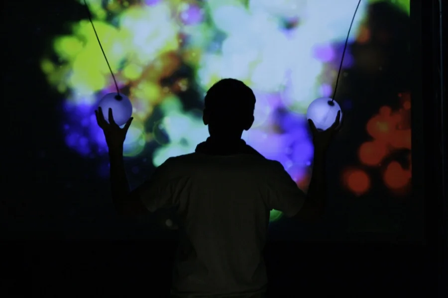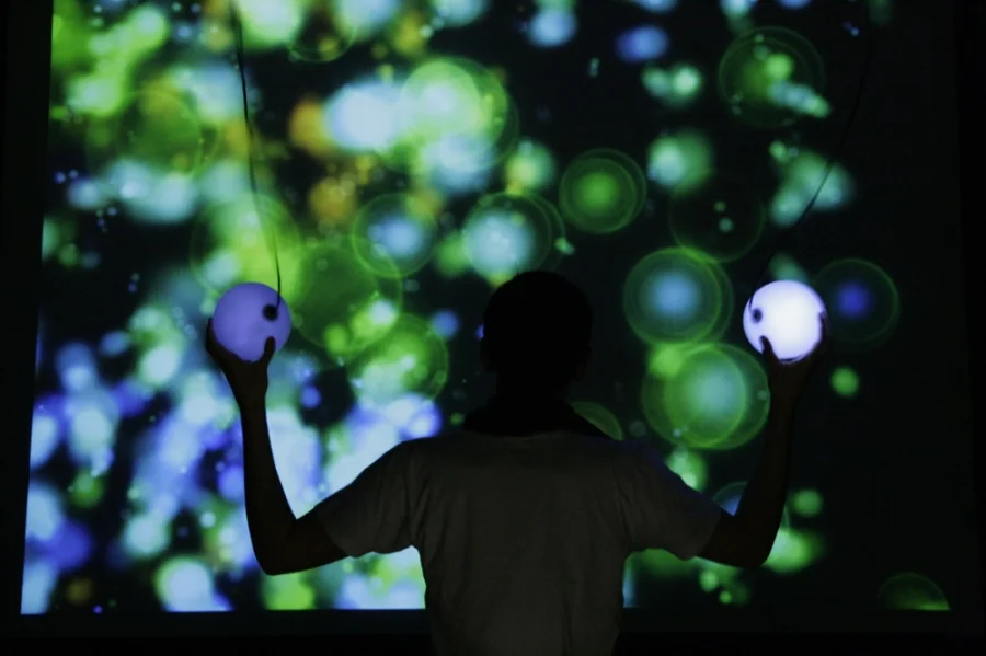 Eine Welt aus amorphen Lichtern ist auf die Wand hinter den Kugeln projiziert. Ein Stereo-Soundsystem sorgt für den Klang. Die drei Komponenten Licht, Sound und Bewegung der Kugeln sind direkt miteinander verbunden und beeinflussen sich gegenseitig.