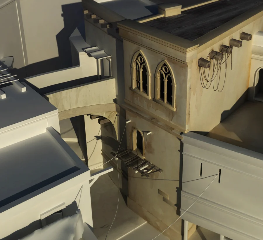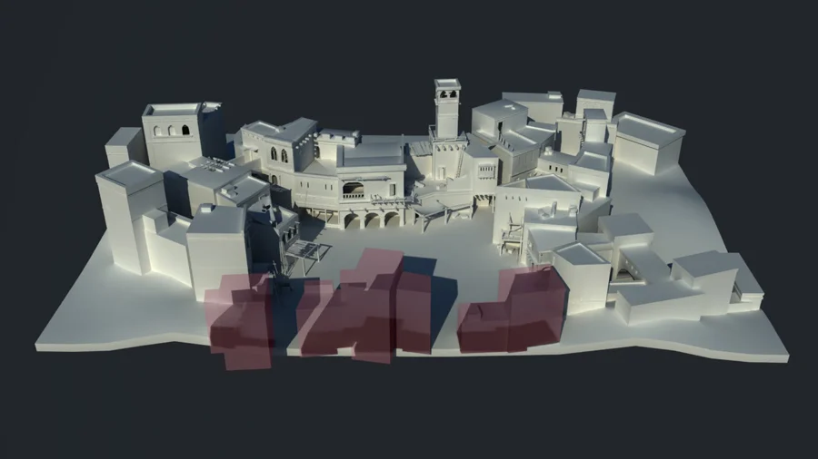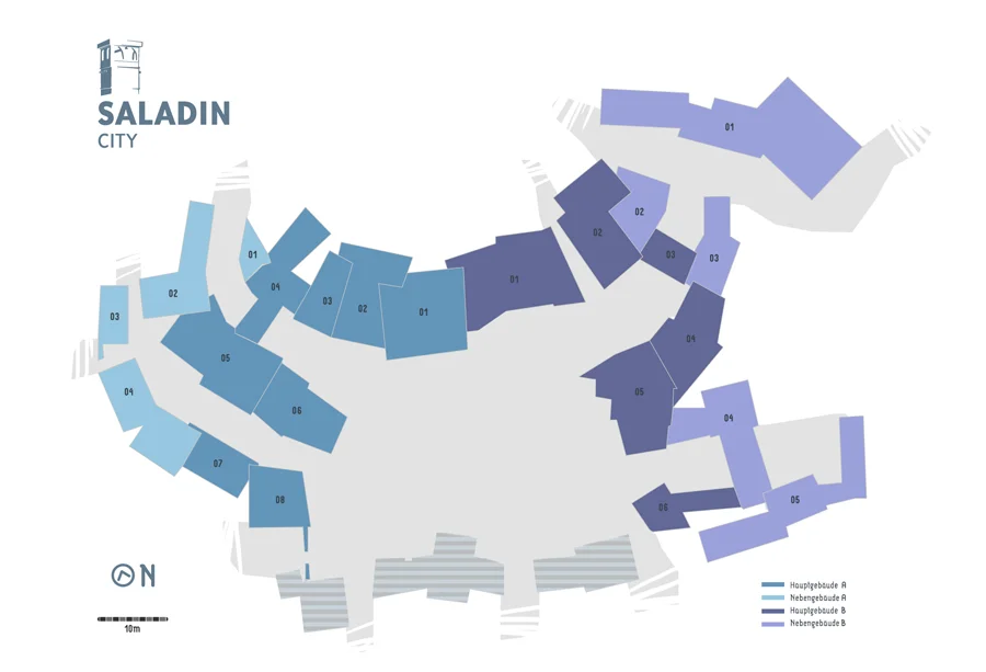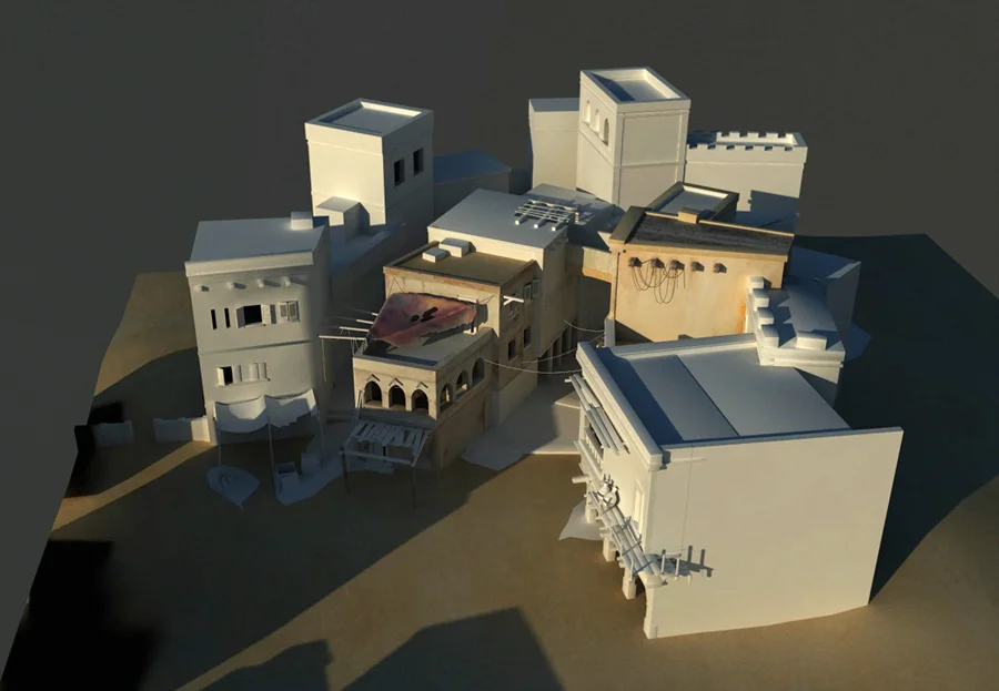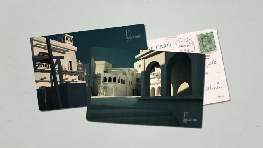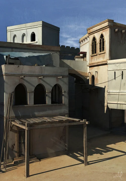 „saladin city“ basiert auf einem fiktiven grundriss einer kleinen stadt im mittleren osten um 1100 n.C., und wurde in cinema 4d modeliert. die texturen sind komplett als analoge zeichnungen anlegen, um am ende einen gezeichneten charakter zu erhalten und die vor-und nachteile von analog und digital zu vereinen.