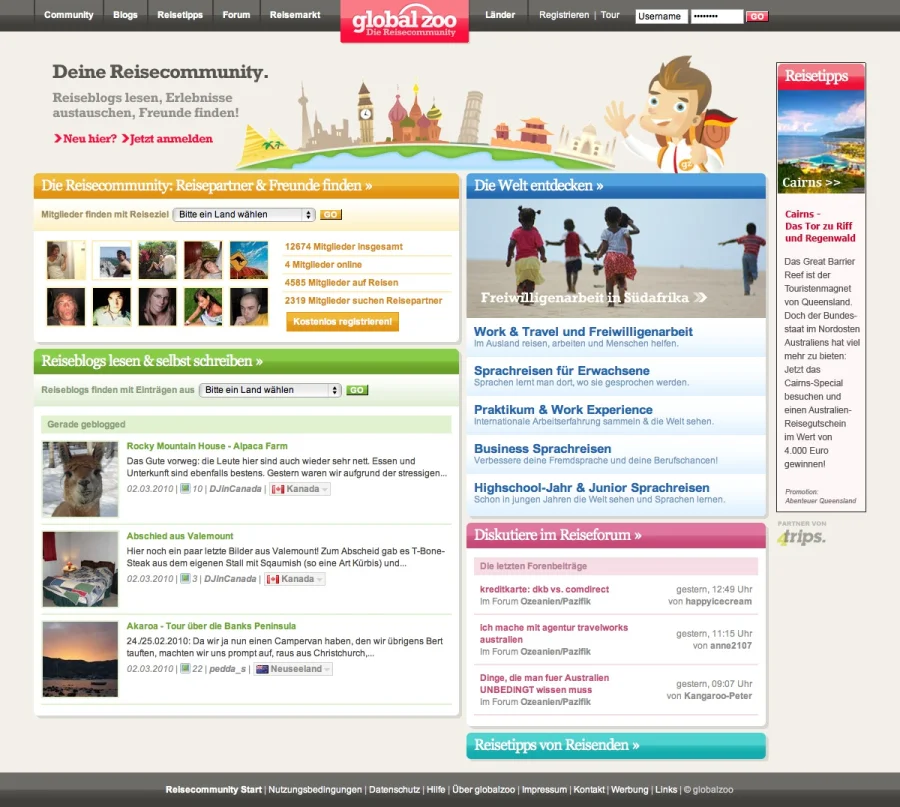 Umfangreiche Reisecommunity mit Blogging-Features und Profilseiten fuer Globetrotter aus Deutschland, Österreich und der Schweiz.