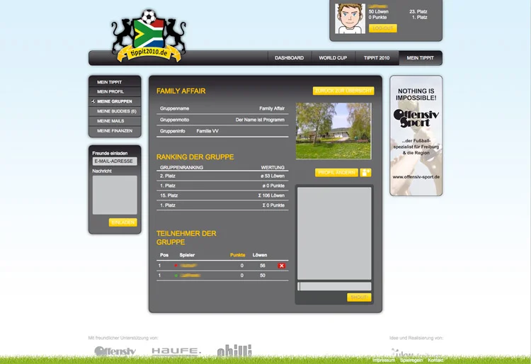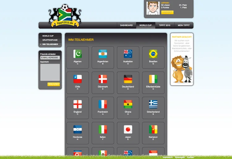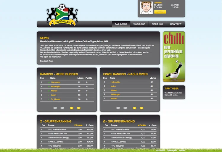 tippit2010 ist eine kostenlose Community zur Fußball-WM in Südafrika. Im Zentrum steht das Tippspiel in dem neben der klassischen Punktewertung auch mit einer fiktiven Währung, den Löwen, Wetteinsätze auf die WM-Spiele gemacht werden können.