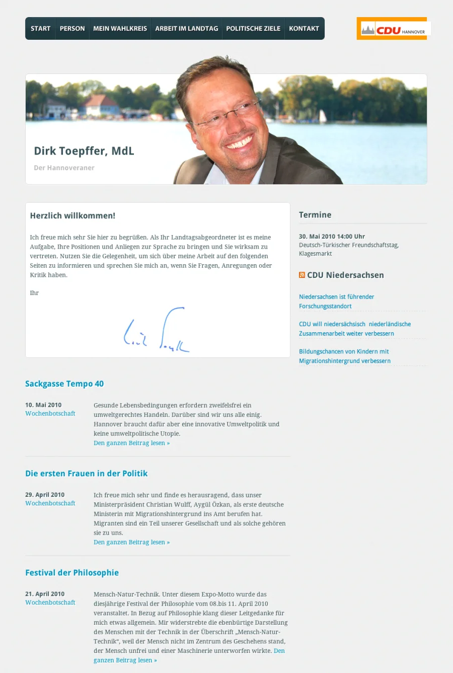 Design und Development der Webseite des niedersächsischen Landtagsabgeordneten Dirk Toepffer. CMS-Unterstützung durch WordPress. HTML5, CSS3 und jQuery.
