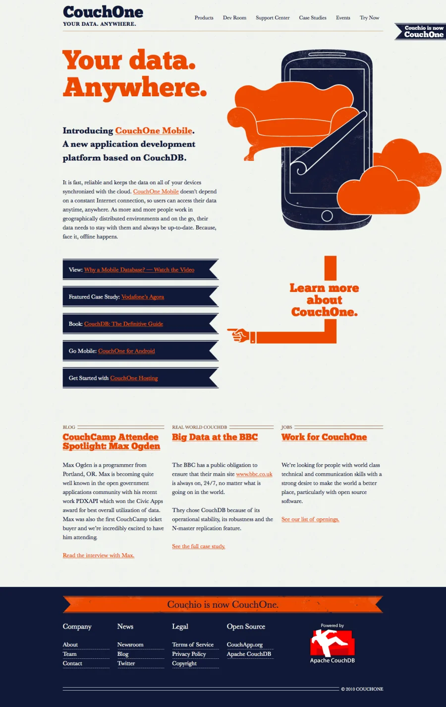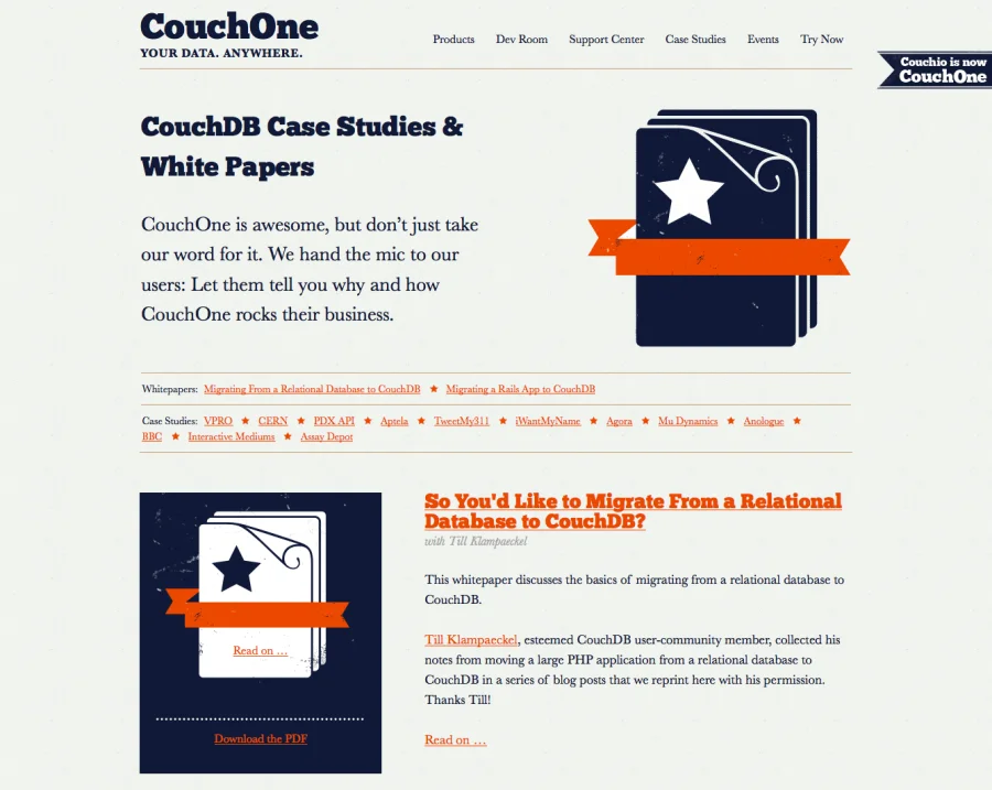 CouchOne bietet Produkte und Support zur Open Source-Datenbank CouchDB. Die Website dient außerdem als Anlaufstelle für die CouchDB-Community.