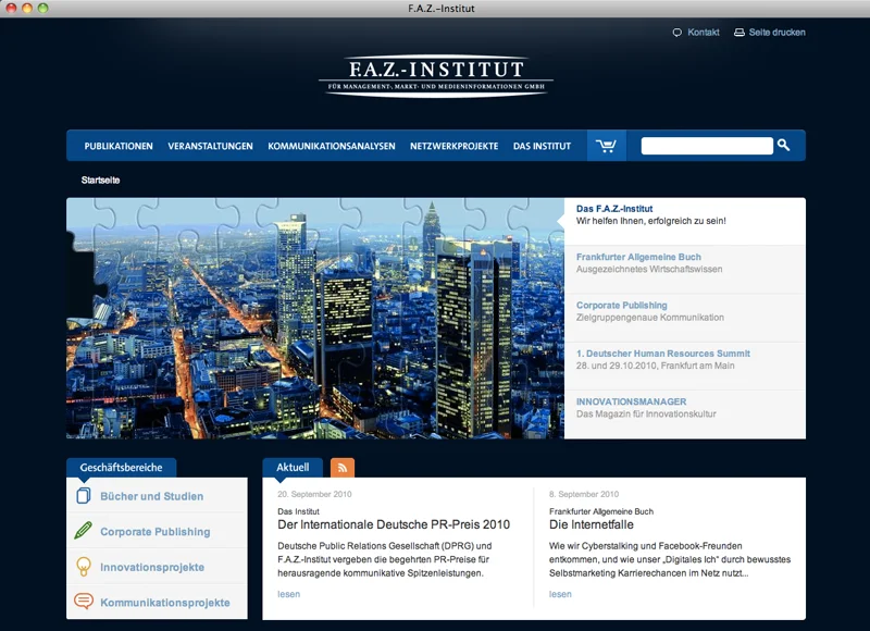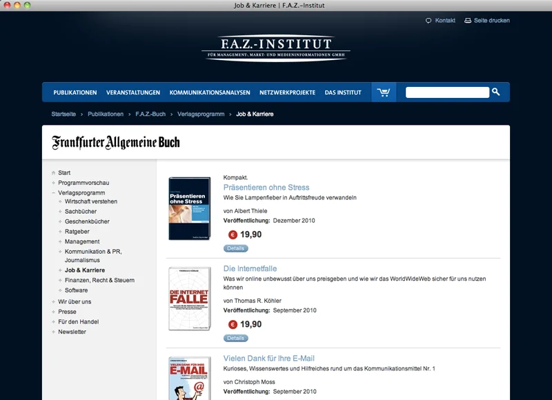 Pünktlich zur Frankfurter Buchmesse ging der neue Onlineauftritt des F.A.Z.-Instituts online. Mehr Präsentationsspielraum, ein modernes Erscheinungsbild, eine komplette Reorganisation der Produktstruktur und ein voll integriertes E-Commerce-System waren die Hauptanforderungen an den neuen Auftritt.