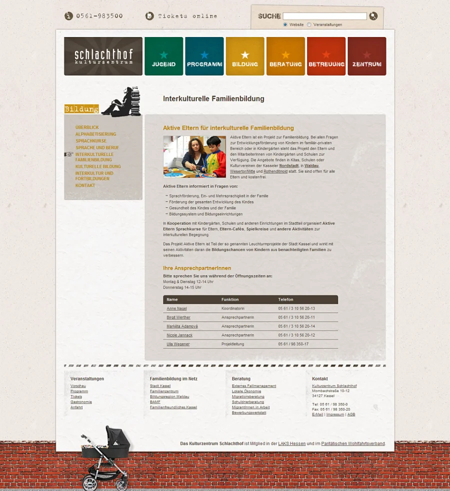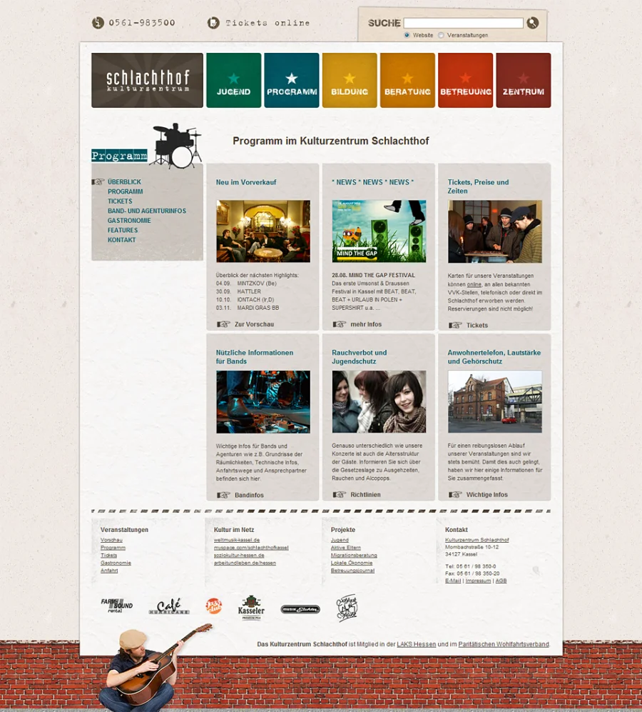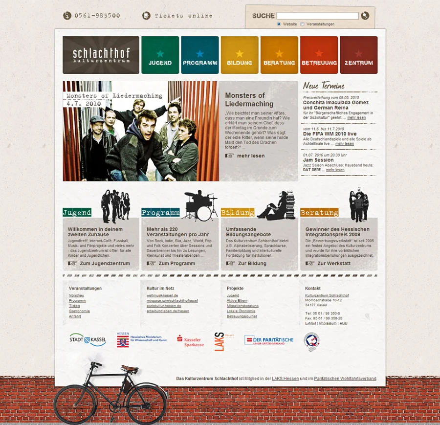 PLUSX.de hat die Website des Schlachthof Kassel komplett erneuert. Kein Stein ist auf dem anderen geblieben. Die inhaltliche Struktur wurde überarbeitet und übersichtlich in sechs Menüpunkten dargestellt, die sich in einem bis zu dreistufigen Untermenü verzweigen. Das Erscheinungsbild wurde für den Internetauftritt neu erdacht und bedient sich verschiedenen Elementen aus Grunge, Retro und Urban. Es vermittelt eine authentische Atmosphäre, die sich gewollt von “cleanen”, öffentlichen Einrichtungen abhebt.