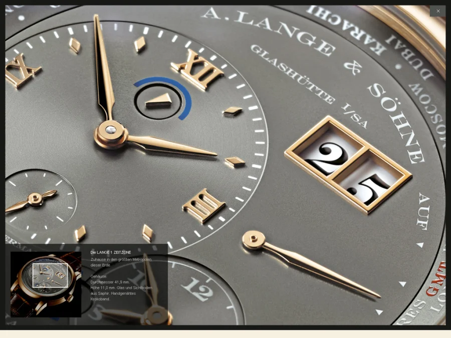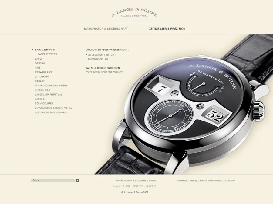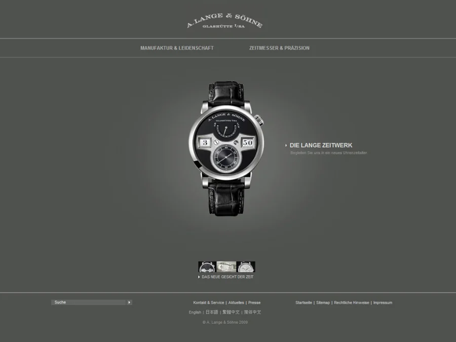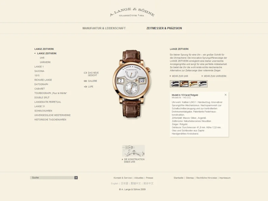 Realisiert wurde die Ansprache der Zielgruppen durch die großzügigen Flächen in elegantem Grau und den Verzicht auf dekorative Elemente. Im Fokus, auch räumlich, natürlich die Zeitmesser. Darüber hinaus: multimediale Inhalte, z.B. das LANGE ZEITWERK Webspecial und weitere diverse Rich-Internet-Applications wie die Lupenfunktion und das Montagebuch.