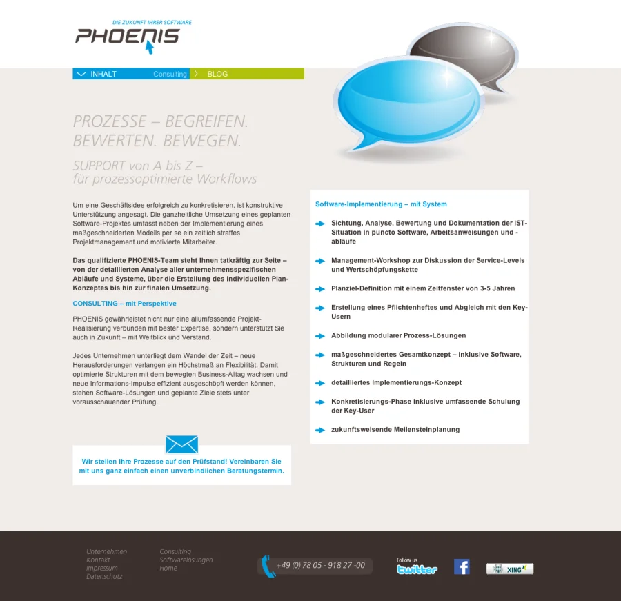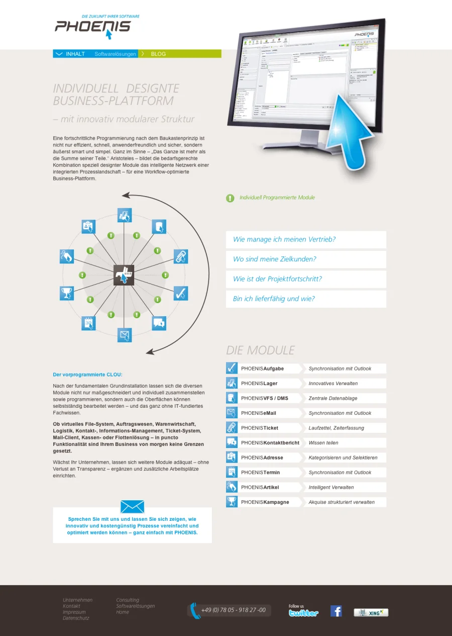 Realisierung einer Corporate Identity für “PHOENIS Gesellschaft für angewandte Informatik mbh”. Hier zu sehen die Website, die zum Start des Unternehmens online ging.