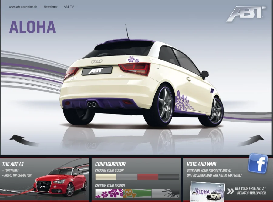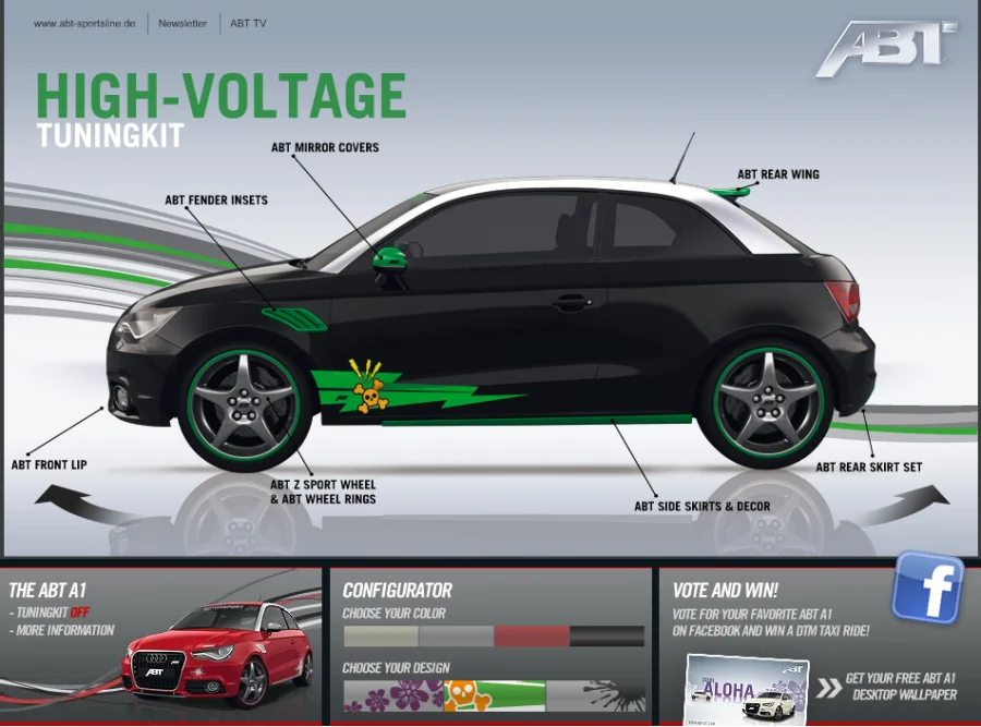 Farbkonzept für Tuninganbauteile und Dekor-Design, Konzeption, Design und Umsetzung des Intros und der Microsite zum Einführung des neues A1 Audi´s von ABT-Sportsline.