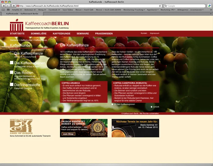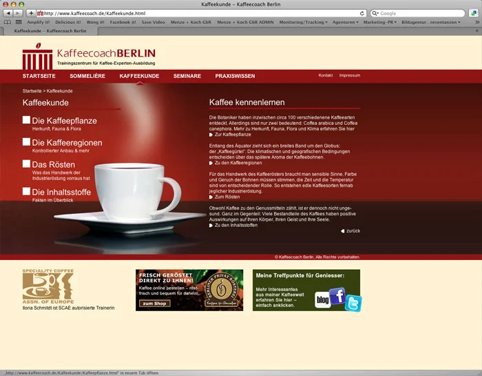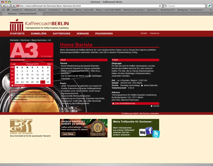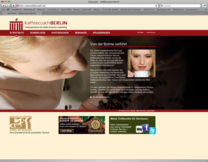 Inzwischen weiß jeder, wie gern wir Kaffee trinken. Deswegen war auch der Relaunch der Website von Kaffeecoach Ilona Schmidt ein besonderer Genuß. Große emotionale Bilder auf allen Einzelseiten mit prägnanten Informationen wurden durch einen integrierten Kalender ergänzt. Im Social Media Bereich sind wir für alle Marketingmaßnahmen zuständig.