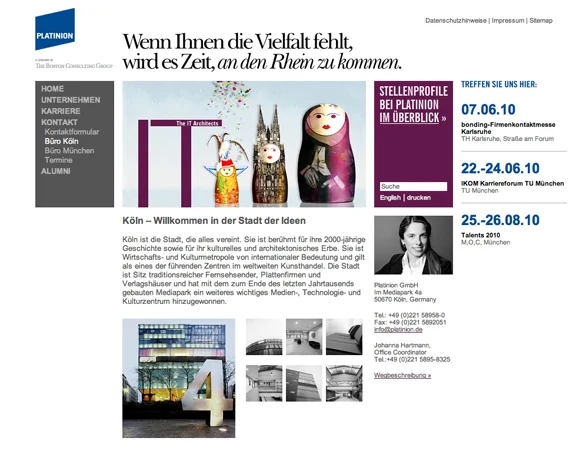 Platinion ist eine Tochtergesellschaft der Boston Consulting Group und ergänzt die Strategieberatung der BCG um IT- und prozessbezogene Konzeptions- und Implementierungsberatung. Die Website richtet sich primär auf das Recruiting neuer Mitarbeiter.