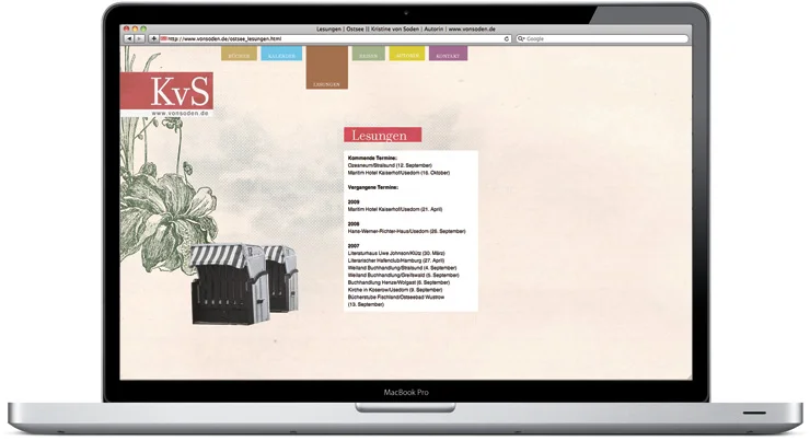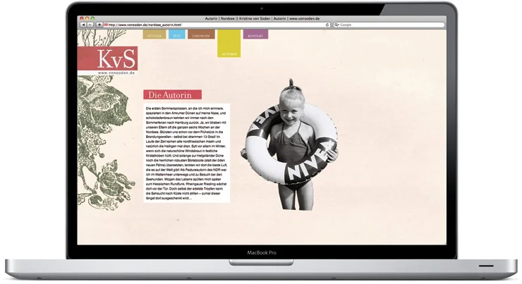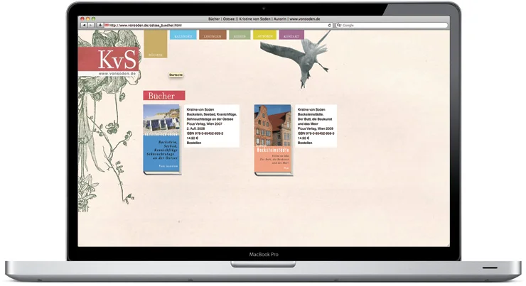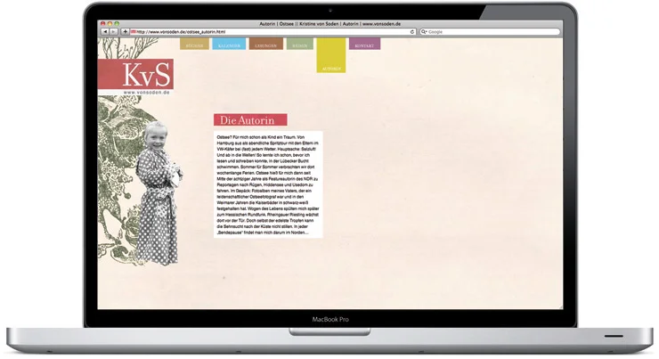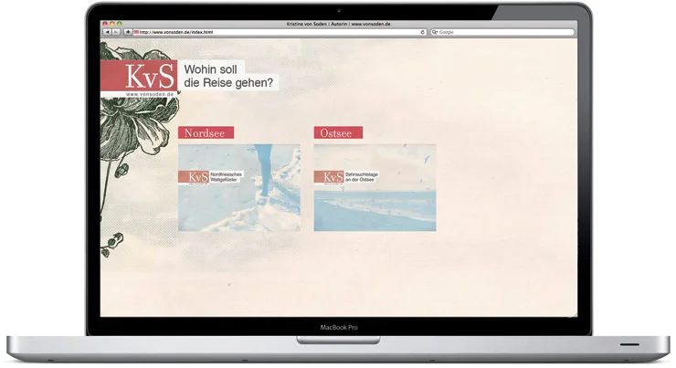 Dr. phil. Kristine von Soden veröffentlicht Bücher und Kalender mit den Schwerpunkten Nord- und Ostsee und arbeitet unter anderem für den hessischen Rundfunk. Zur Promotion ihrer Veröffentlichungen und der literarischen Reisen haben wir ein an die Stimmung der Nord- und Ostsee angepasstes Corporate Design entwickelt, das anschließend auf Broschüren, Geschäftsausstattung und Webseite adaptiert wurde.