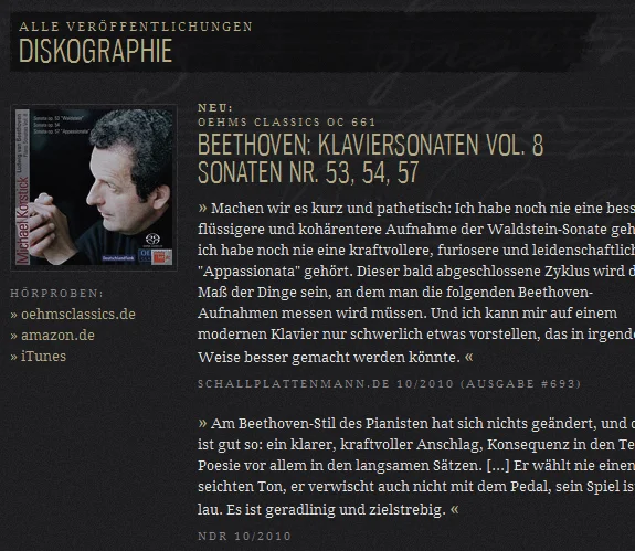 Der deutsche Pianist Michael Korstick setzt mit seinen Beethoven- und Schubert-Interpretationen Maßstäbe. Neben zahlreichen anderen Auszeichnungen gewinnt er 1995 den ECHO Klassik. Schon seine Mitstudenten an der New Yorker Juilliard School nennen ihn “Dr. Beethoven”, und heute zählt Michael Korstick zu den bedeutendsten deutschen Pianisten überhaupt.