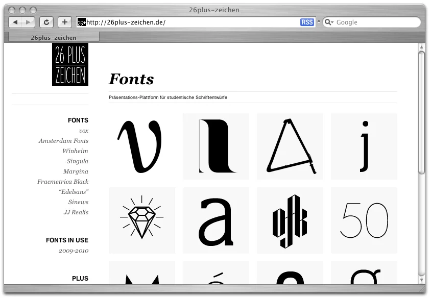Seit kurzem bietet die Seite www.26plus-zeichen.de die Möglichkeit hochwertige, studentische Schriftentwürfe zu begutachten, auszuprobieren, zu kommentieren und vor allem auch zu präsentieren! Von schmuckvollen Displayschriften bis zu umfangreich ausgebauten Textschriften ist der Großteil aller Fonts kostenlos zu haben.