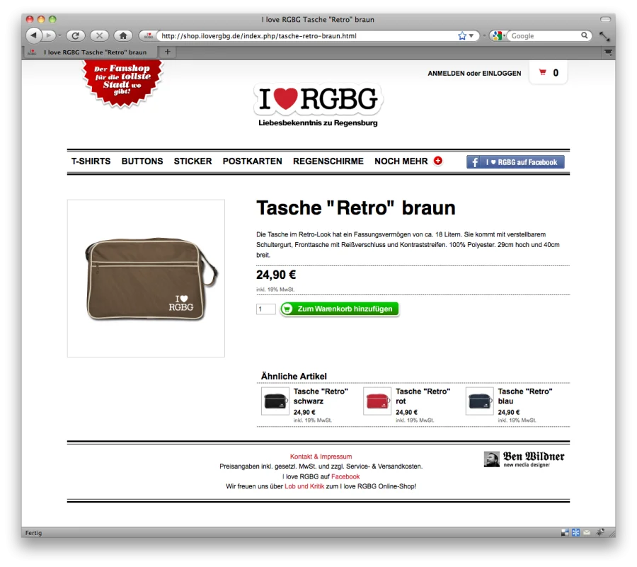 Aus der Liebe zu meiner Heimatstadt Regensburg entstand als erstes eine Facebook-Fanpage, welche aktuell knapp 10.000 Fans zählt. Schnell wurden erste Stimmen laut und forderten Merchandise-Artikel mit dem Aufdruck des auf der American Typewriter basierenden Logo. Schnell noch einen Magento Commerce Shop gebastelt und los gings mit Ansteckbuttons, Stickern und Postkarten, gefolgt von T-Shirts bis hin zu Hunde-Bandanas und Regenschirmen.