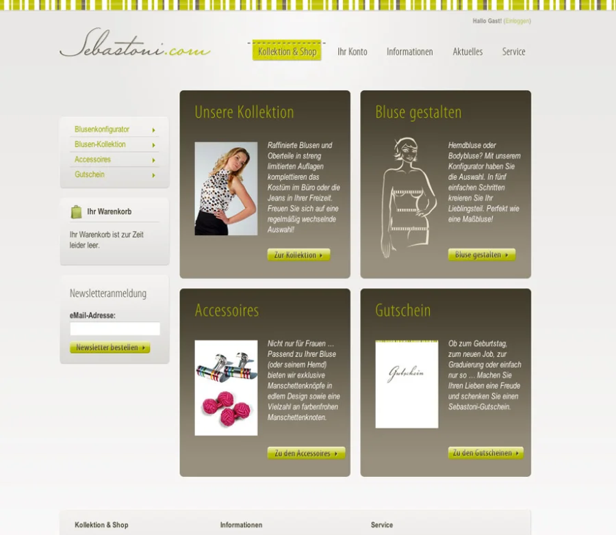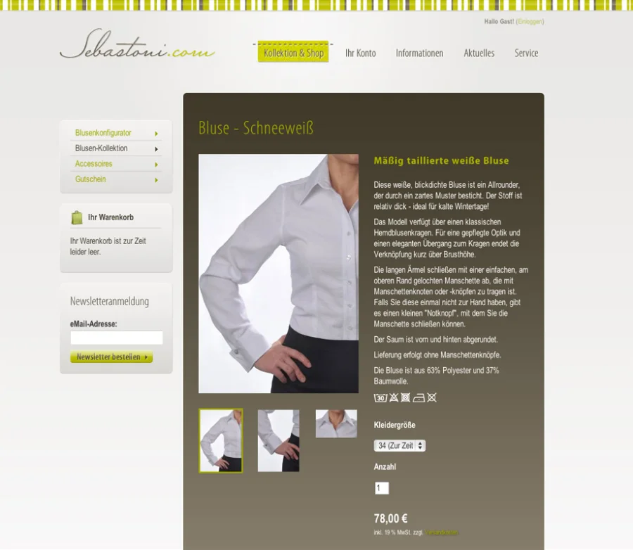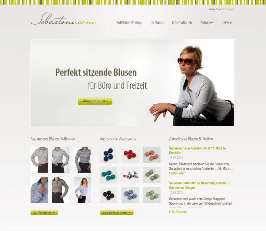 Für die neue Marke Sebastoni sollte ein Onlineshop produziert werden, der es erlaubt, eine Bluse individuell zusammenzustellen. Weiterhin werden saisonale Kollektionen sowie Accessoires angeboten.