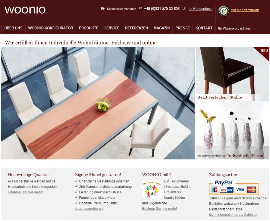 Die Woonio Webseite ist eine Kombination aus Imageauftritt und Online-Shop und vermittelt hochwertige deutsches Möbeldesign in seiner modernsten und individuellsten Form. Plattform und Tische sind Made in Germany.