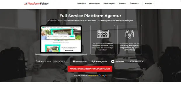 Plattform Faktor ist ein innovatives Start-up aus München, welches sich auf die Entwicklung von Online-Plattformen spezialisiert hat. Hinzu kommt ferner ein neuartiges und innovatives Konzept, welches die Erfolgsaussichten für den Kunden und die Agentur erhöht und maßgeblich dafür verantwortlich ist, dass Plattform Faktor heute zu einem der Marktführer in seiner Branche gehört.