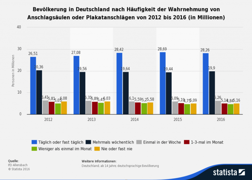 Diese Statistik ist ein Beispiel dafür, dass Werbung an Anschlagsäulen durch Plakate beinahe täglich wahrgenommen wird. Dies geschieht meist unterbewusst, da Plakatwerbung sehr unauffällig ist und die Menschen sich daran gewöhnt haben. Es ist dabei egal, ob sie nur einen flüchtigen Blick auf die Werbung werfen oder sich intensiv mit ihr auseinandersetzen.